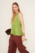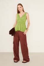 A Blusa Decote é uma peça sofisticada e vibrante, perfeita para elevar qualquer produção com seu design estruturado e elegante. O modelo apresenta um decote V profundo e transpassado, criando um efeito drapeado sutil que valoriza o busto e o colo. As alças são largas e drapeadas nos ombros, com um charmoso decote profundo nas costas, onde as alças se cruzam e se encontram para amarração. O caimento é fluido na barra, com uma leve peplum que se forma a partir do franzido na cintura, proporcionando movimento e um toque de feminilidade. O fechamento é feito por amarrações delicadas nas costas, o que garante um ajuste perfeito e um detalhe visual surpreendente.