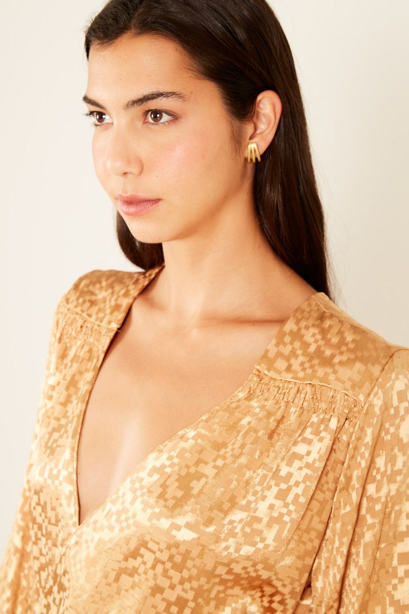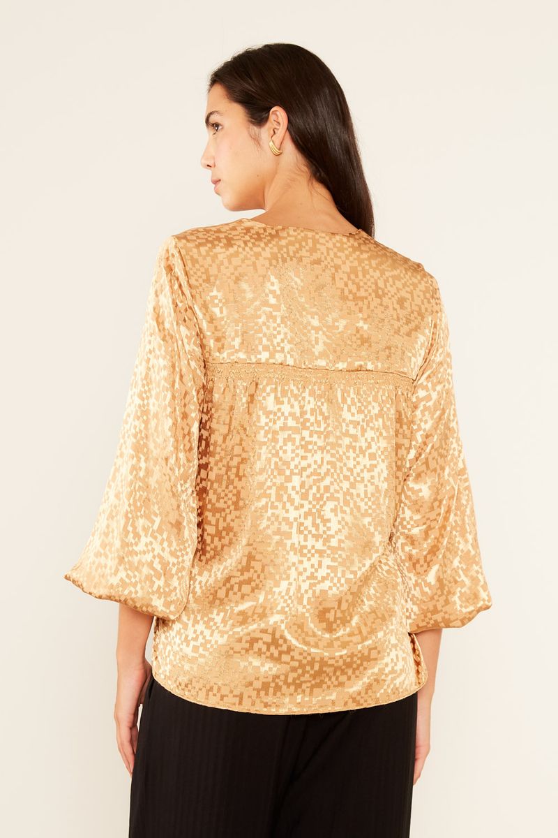 A Blusa Manga Jacquard Play é uma peça elegante e versátil, com modelagem ampla e caimento fluído que oferece conforto e sofisticação. O decote em V na frente e nas costas adiciona um toque refinado, enquanto a manga 3/4 com detalhe de franzido e elástico na barra confere um charme único. A peça possui fechamento por amarração na cintura, que permite ajustar a silhueta de forma delicada. O destaque fica por conta do tecido em jacquard com a trama sutil do desenho, que cria um efeito visual moderno e texturizado.