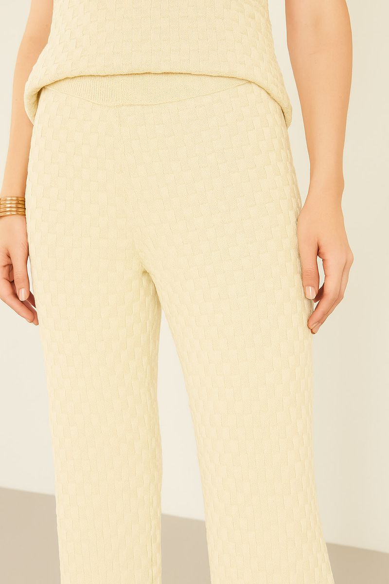 A Calça Tricot Quadradinhos é a peça que une conforto máximo e um visual texturizado de puro impacto, tornando-a um item de desejo imediato. Confeccionada em tricot, ela se destaca pela sua textura de quadradinhos que confere uma riqueza visual e um toque macio. O cós é alto e largo, feito no próprio tricot para garantir um ajuste confortável e sem a necessidade de fechamento. A modelagem é ajustada no quadril e segue a tendência boot cut na barra, com caimento fluído que proporciona movimento e alonga a silhueta. Perfeita para quem busca um visual sofisticado com a praticidade do tricot.