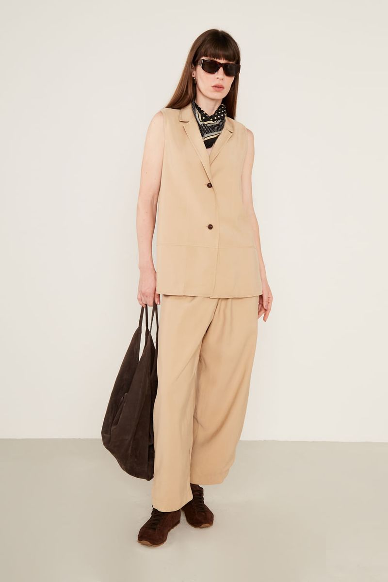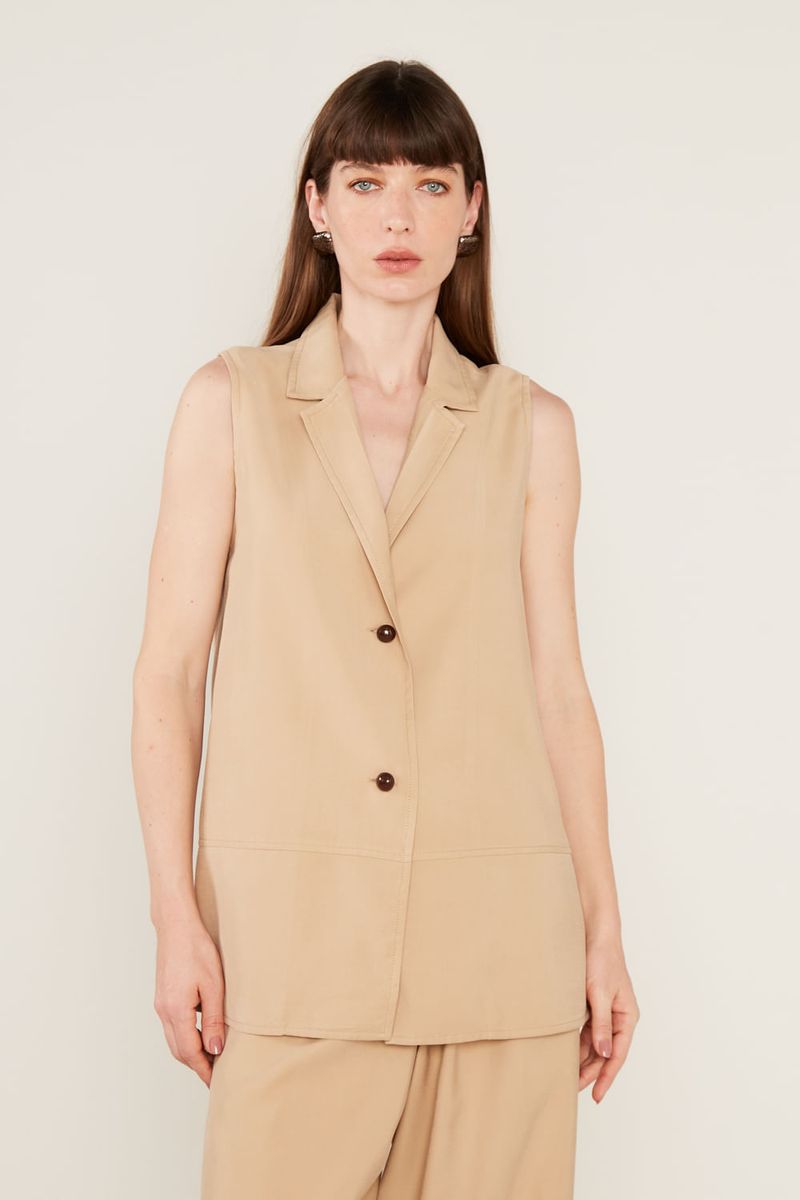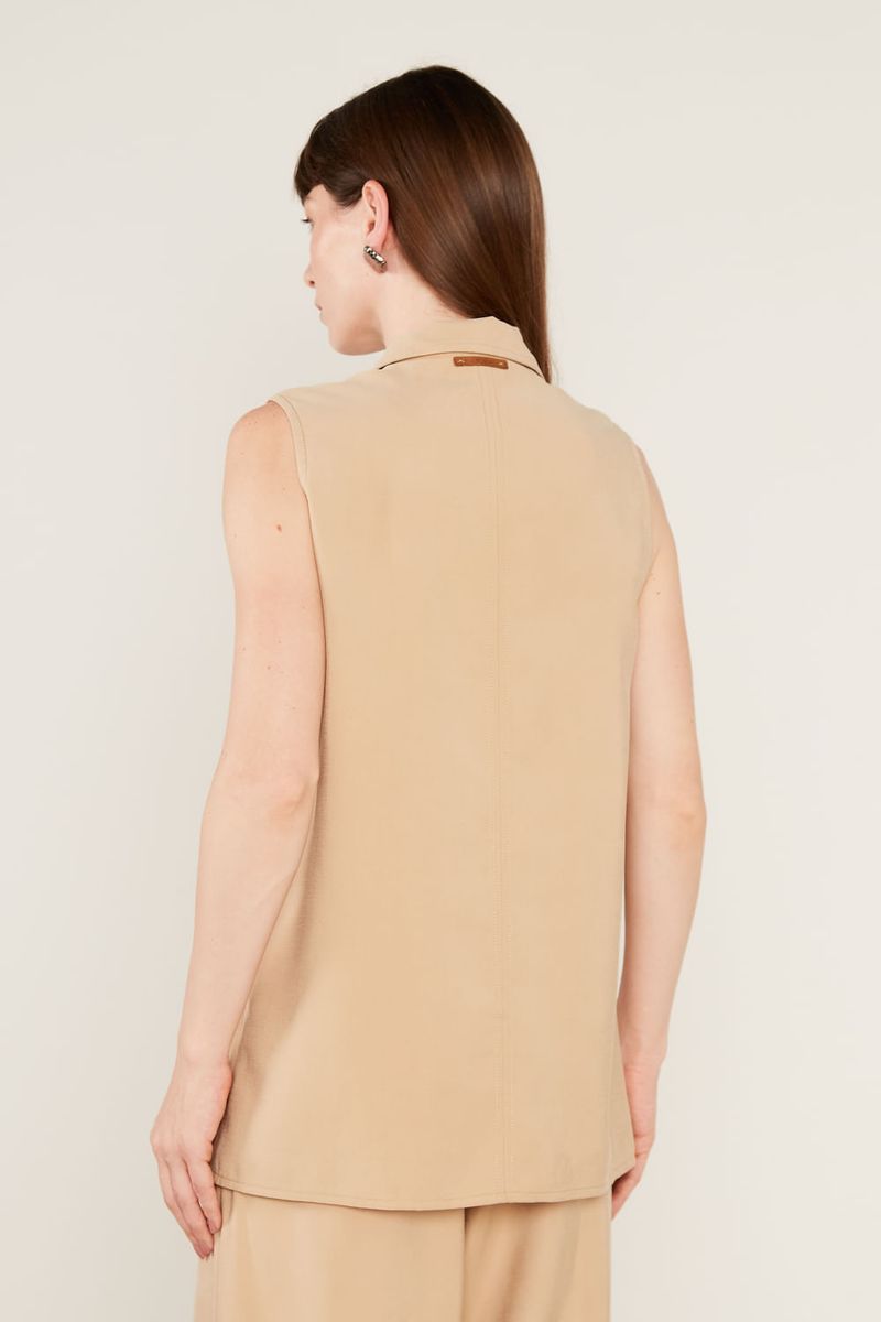 O Colete Alongado é a peça-chave para elevar qualquer produção com um toque de alfaiataria moderna e sofisticada. Sua modelagem reta e estruturada apresenta um decote clássico com gola e lapelas bem definidas, que se estendem até o fechamento frontal por botões contrastantes, conferindo um ar polido ao visual. Sem mangas, o design privilegia um caimento fluido e levemente solto ao corpo, enquanto o comprimento estendido abaixo do quadril cria uma silhueta longilínea e elegante.