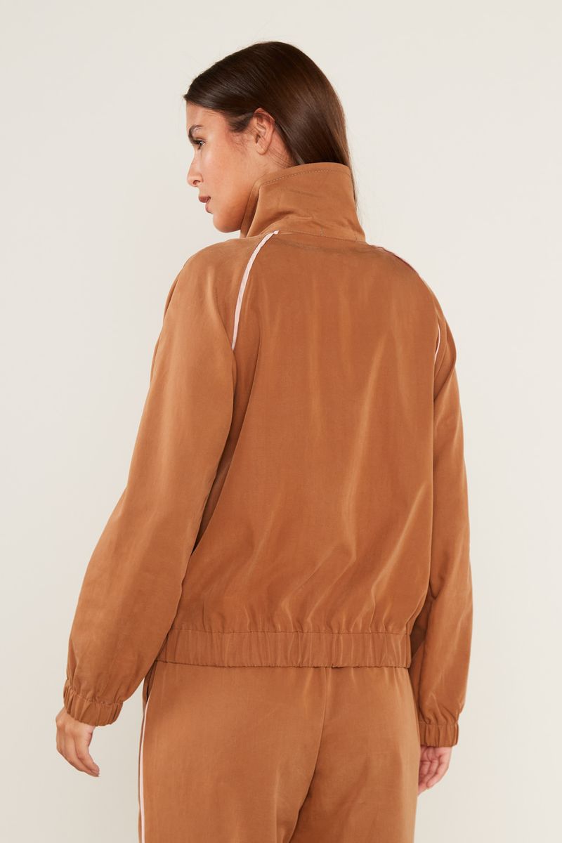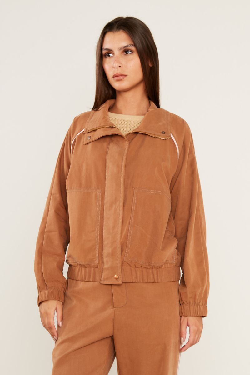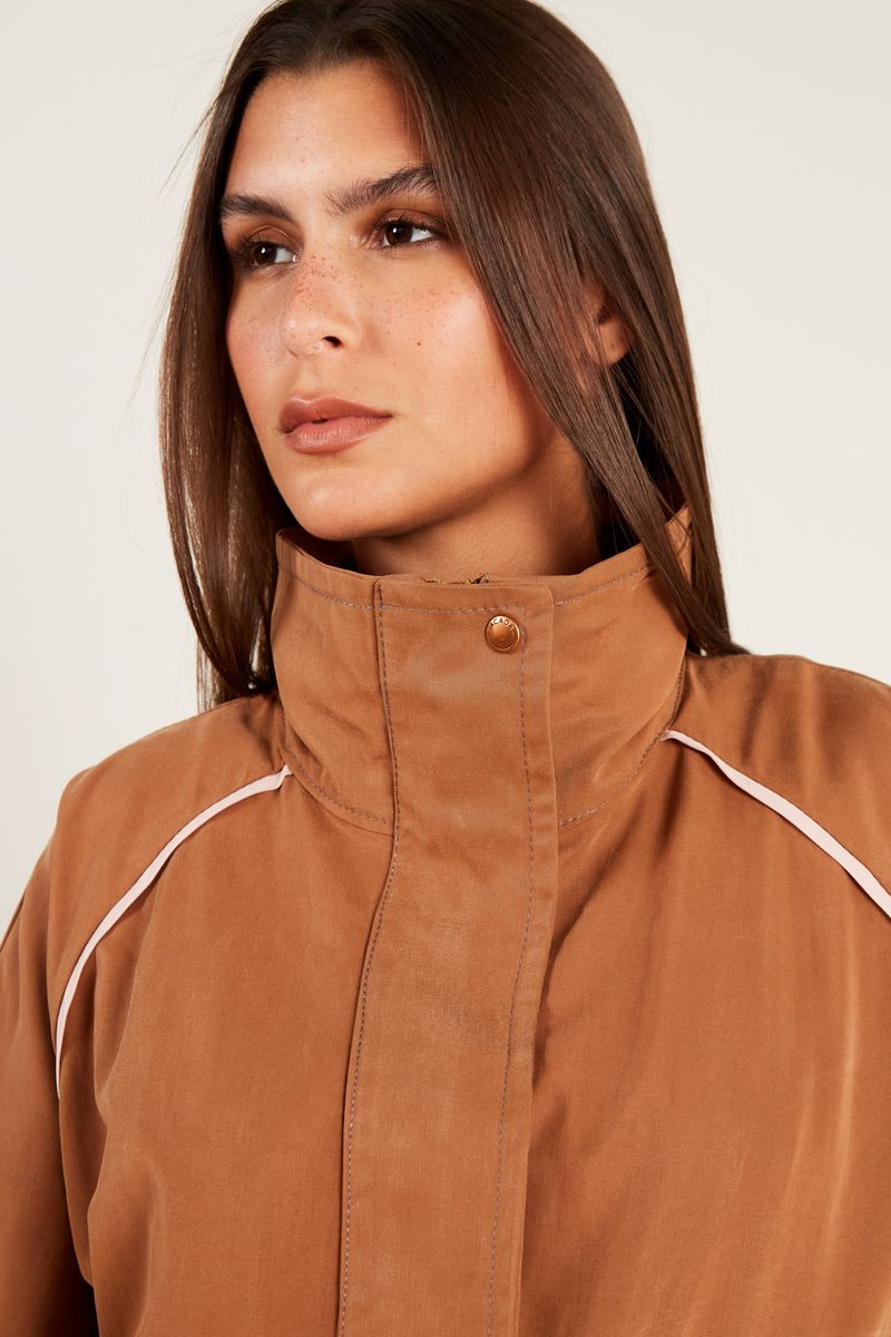 A Jaqueta Sarja Raglan redefine o conceito de utilitário chic com uma modelagem bomber moderna e estruturada que garante um volume impecável à silhueta. O design destaca-se pelas mangas longas com recorte raglan, evidenciadas por um friso contrastante que percorre os ombros, e punhos elásticos que proporcionam um ajuste confortável e dinâmico. Possui uma gola alta imponente com fechamento frontal por zíper metálico oculto por uma vista com botões de pressão, além de bolsos utilitários frontais que reforçam sua praticidade estética. Com um caimento levemente solto e barra elástica, esta peça em sarja de toque aveludado oferece versatilidade e sofisticação.
