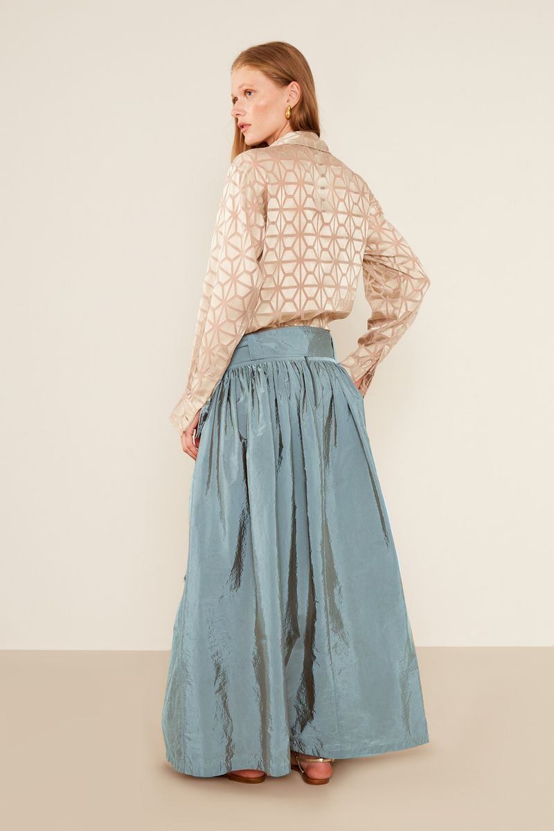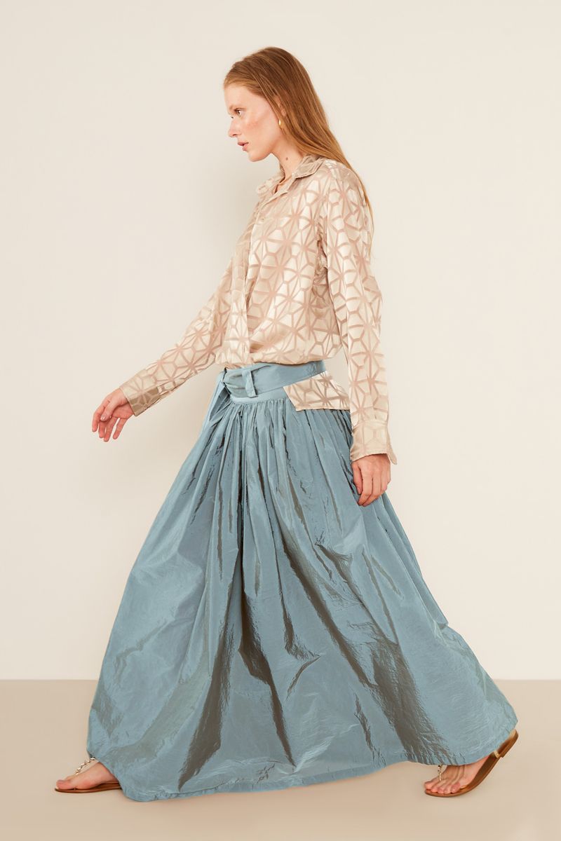 A Saia Techno Faixa apresenta uma modelagem ampla e caimento fluido, com design atemporal e elegante. Possui cós de faixa largo, com elástico nas costas e fechamento lateral por zíper invisível para um ajuste perfeito. O cinto-faixa removível, com passantes e fivela de ajuste, permite diferentes amarrações, adicionando um toque de versatilidade e estilo. O detalhe de pregas frontais e traseiras confere movimento e volume à saia, tornando-a ideal para compor um visual sofisticado e marcante.
