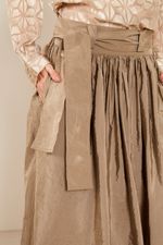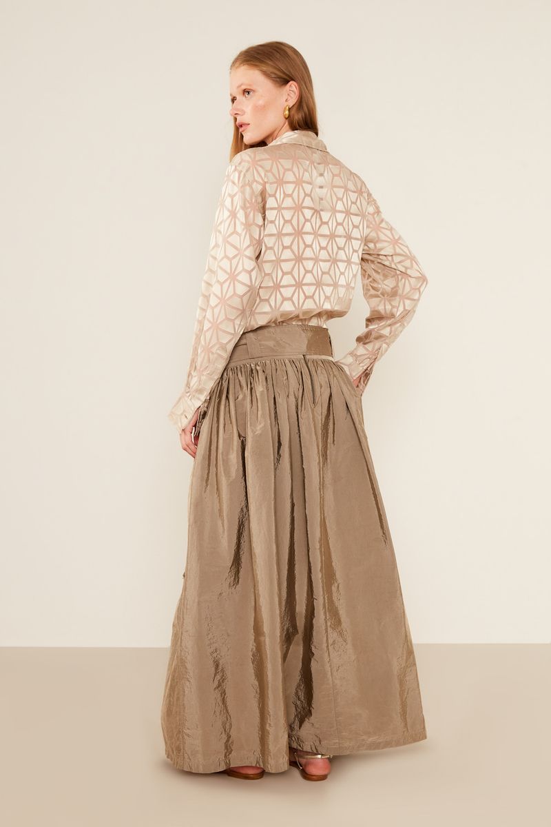 A Saia Techno Faixa apresenta uma modelagem ampla e caimento fluido, com design atemporal e elegante. Possui cós de faixa largo, com elástico nas costas e fechamento lateral por zíper invisível para um ajuste perfeito. O cinto-faixa removível, com passantes e fivela de ajuste, permite diferentes amarrações, adicionando um toque de versatilidade e estilo. O detalhe de pregas frontais e traseiras confere movimento e volume à saia, tornando-a ideal para compor um visual sofisticado e marcante.