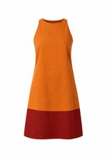 O Vestido Curto Bicolor é uma peça de modelagem evasê que proporciona um caimento leve e fluído, valorizando a silhueta com extrema sofisticação. Confeccionado em tecido de alta qualidade, ele apresenta um design minimalista com decote arredondado e fechado, complementado por cavas levemente acentuadas no estilo regata. O grande destaque visual fica para o contraste harmônico de cores, com o corpo escuro e uma barra larga em off-white, criando um efeito geométrico moderno e atemporal. Sem mangas e sem fechamentos aparentes, a peça prioriza o conforto e a elegância prática.