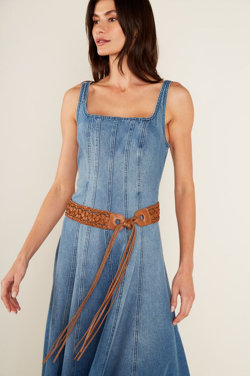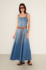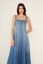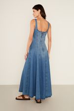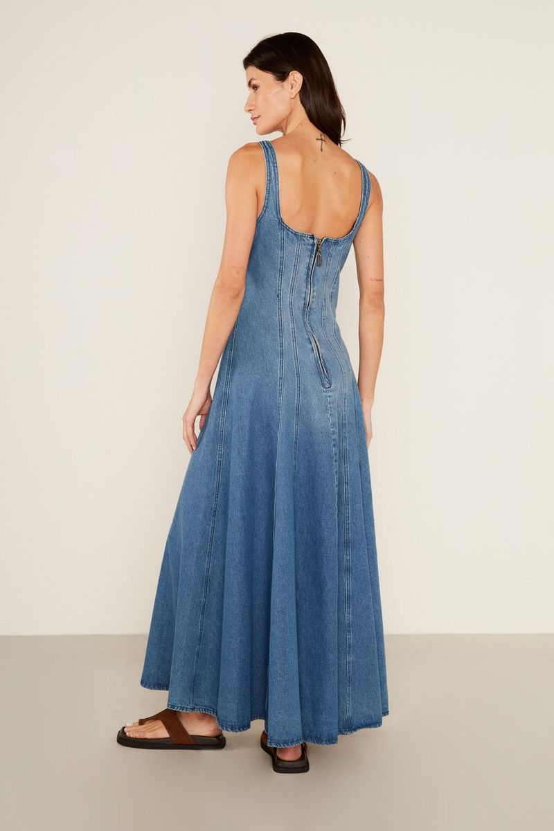 O Vestido Jeans Midi Corset é uma peça icônica que celebra a feminilidade com um toque de modernidade. Com decote quadrado e alças largas, a modelagem ajustada ao corpo na parte superior, remetendo a um corset, é valorizada pelos recortes verticais pespontados. A saia midi evasê com caimento fluido, cria um movimento leve e elegante. O fechamento por zíper invisível nas costas e a ausência de mangas, tornam o vestido perfeito para uma produção de impacto.